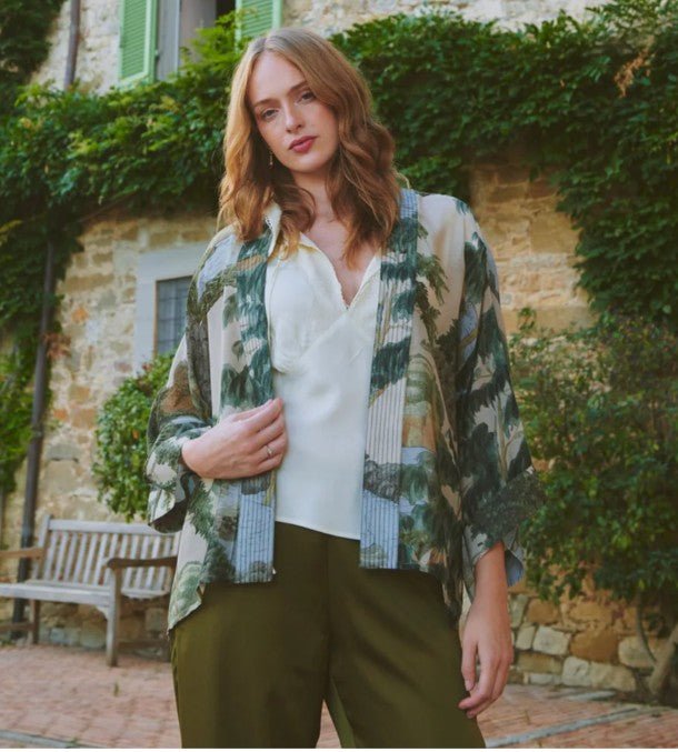 Our bestselling kimono jackets have loose ¾ length sleeves, an open front and a lightly embroidered lapel. Pair with a matching camisole and your favourite jeans in summer or layer over a polo neck during the cooler months